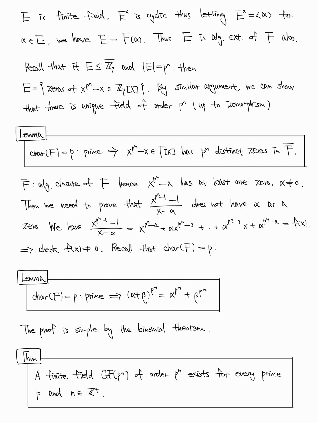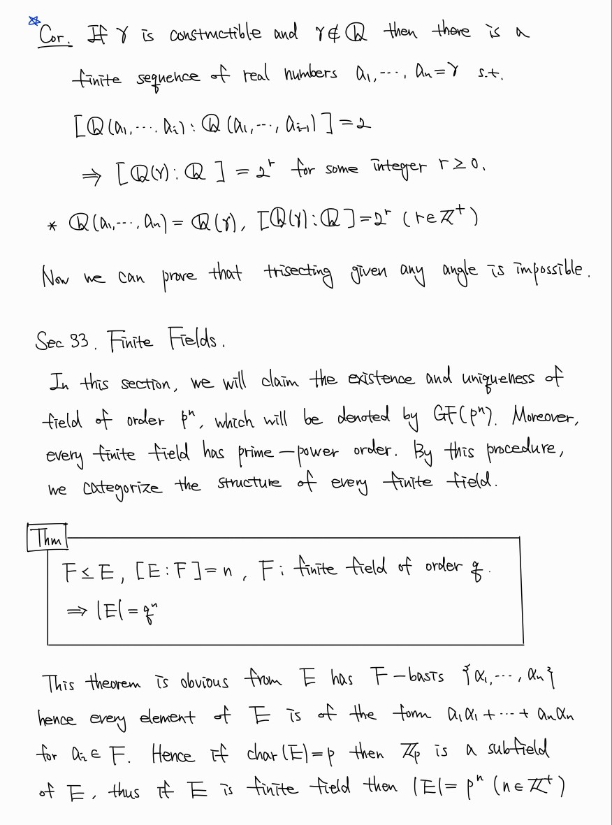 이후 finite field에 대해 공부한다. 모든 finite field는 prime characteristic을 가짐은 이미 알고 있는 사항이다. 이를 통해 임의의 finite field는 prime power order를 가짐을 보였다. 이후 finite field의 structure를 완전히 밝힌다.