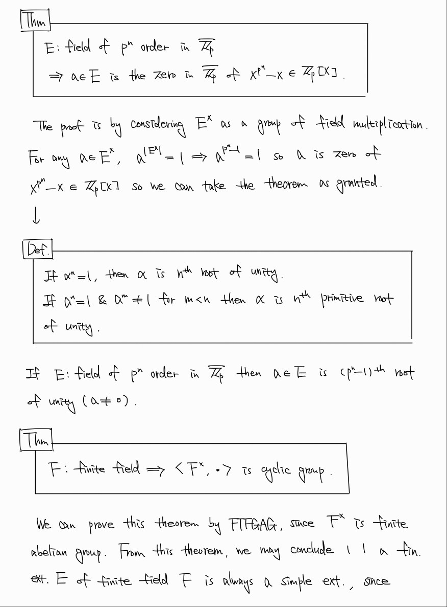 특히 finite field F에서 0을 제외한 것이 곱셈에 대한 cyclic group을 이룬다는 사실은 중요하다. 이 때문에 finite field 의 extension E는 그 한 생성원 a에 대한 simple extension E=F(a)가 될 수밖에 없음을 이해할 수 있다.
