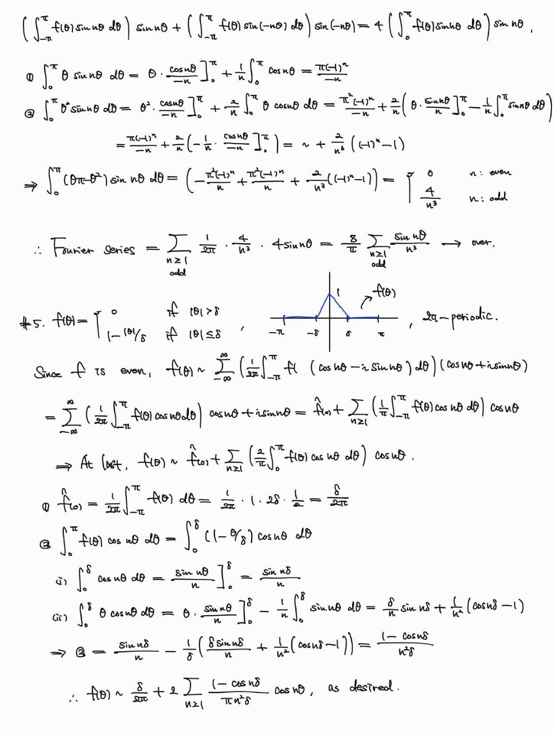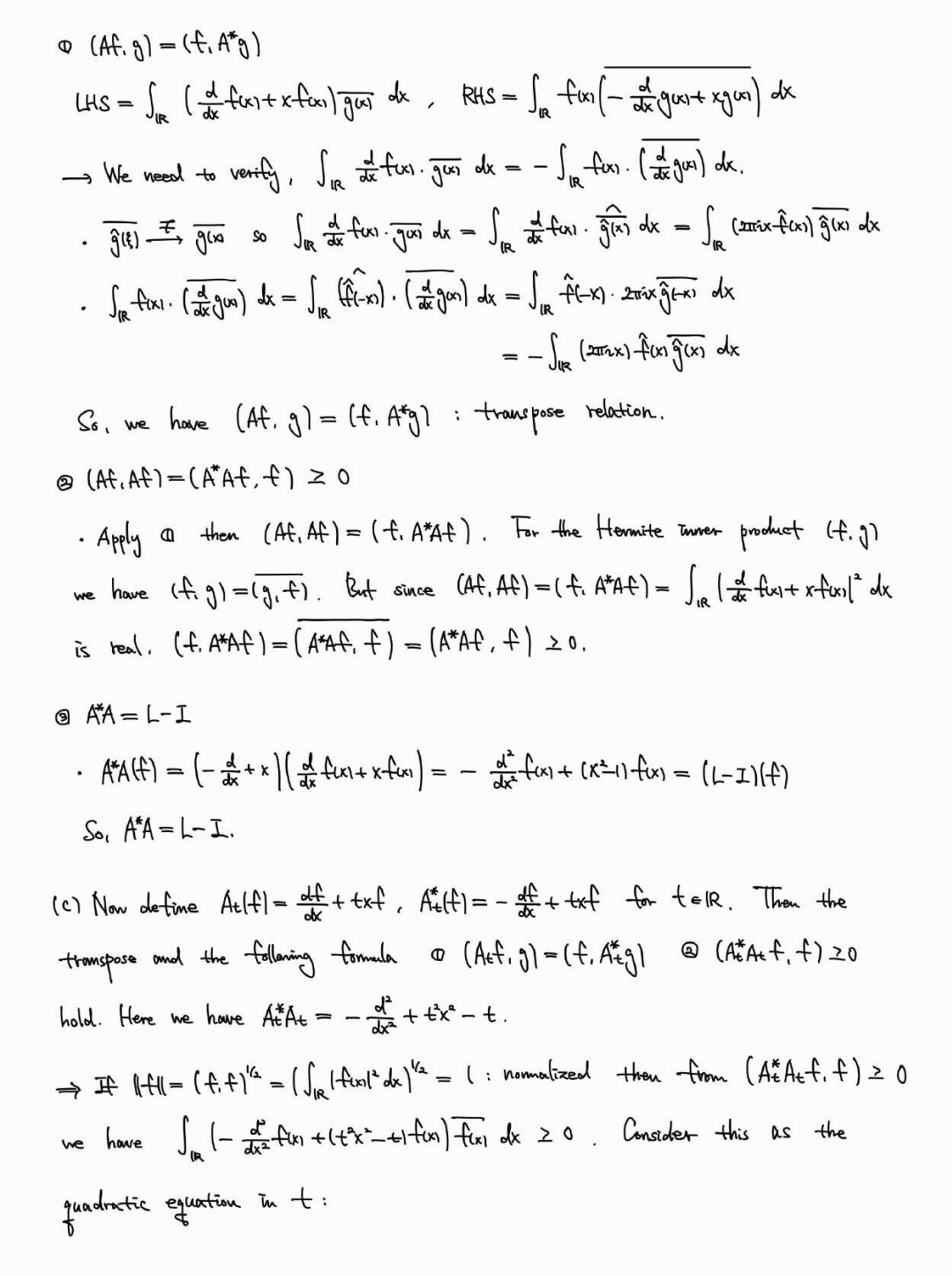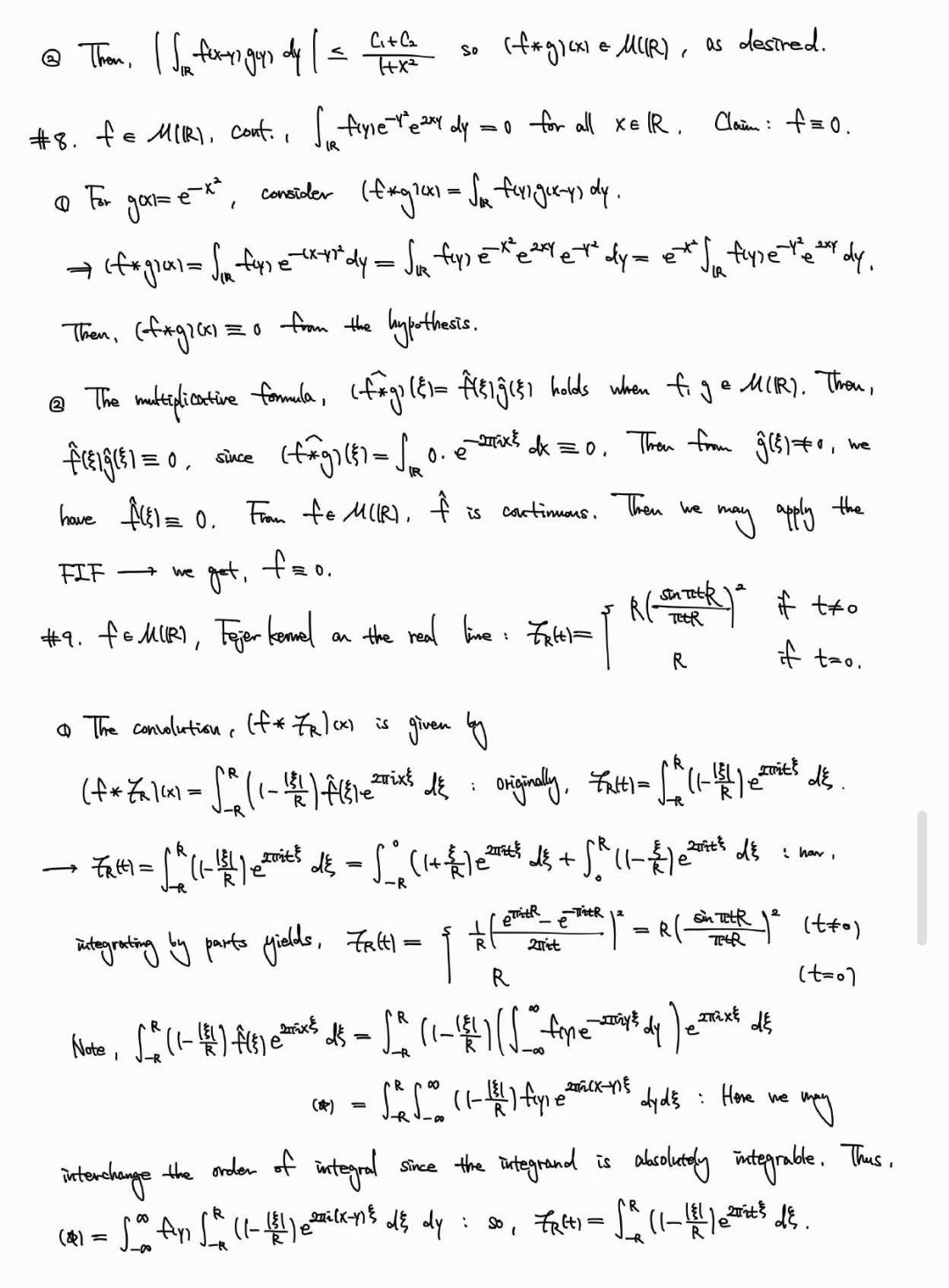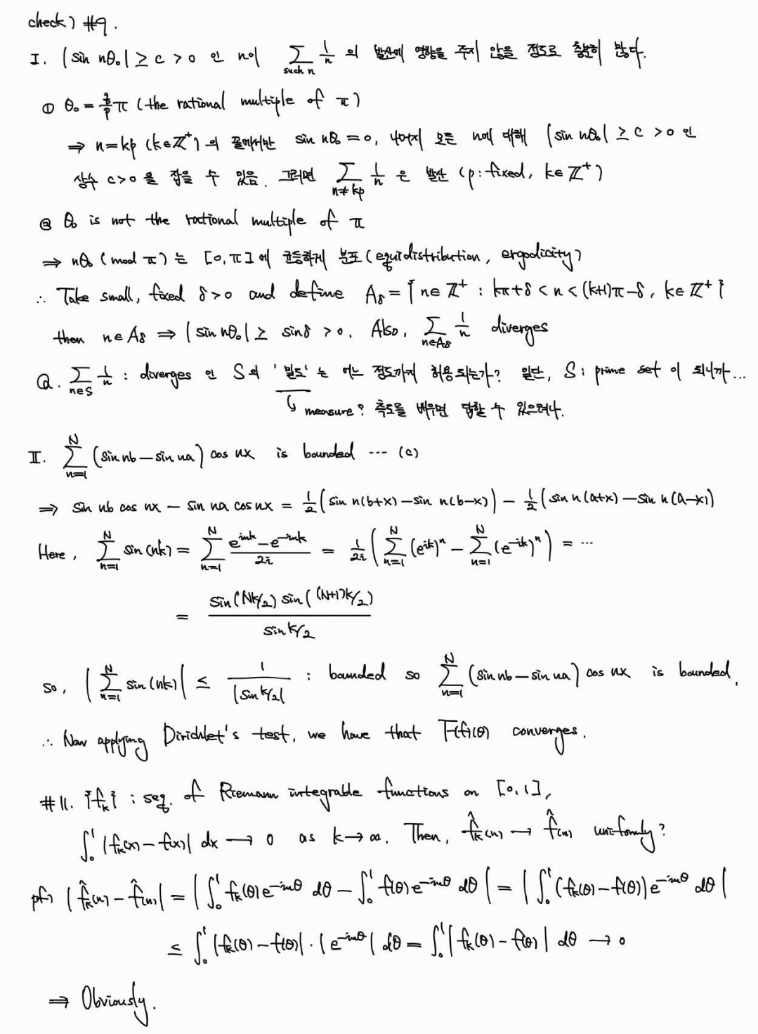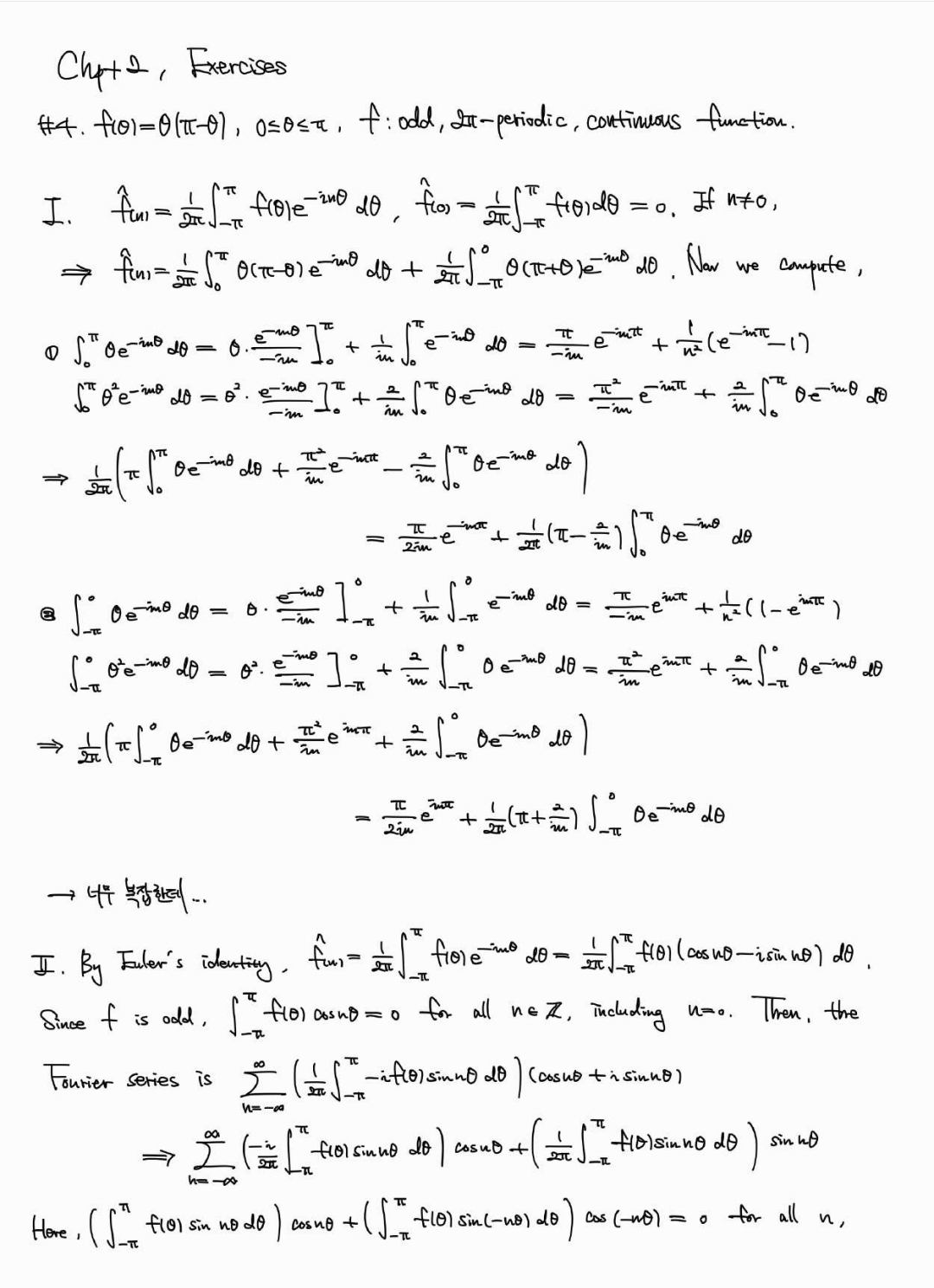아래는 Stein, [Fourier Analysis]의 Chapter 2, 5 연습문제 일부. Chapter 3, 4 연습문제는 군대에 있을때 공부해서 노트에 적었는데 여기에 올리기는 조금 난해하고, Chapter 6은 본문과 연결된 연습문제가 많아 본문을 공부하며 노트에 체크만 해서 풀이집을 따로 만들지 않았다. 교재에 힌트가 있어 푸는게 그렇게 어렵지는 않지만... 도움이 되는 사람이 있으면 좋겠다.