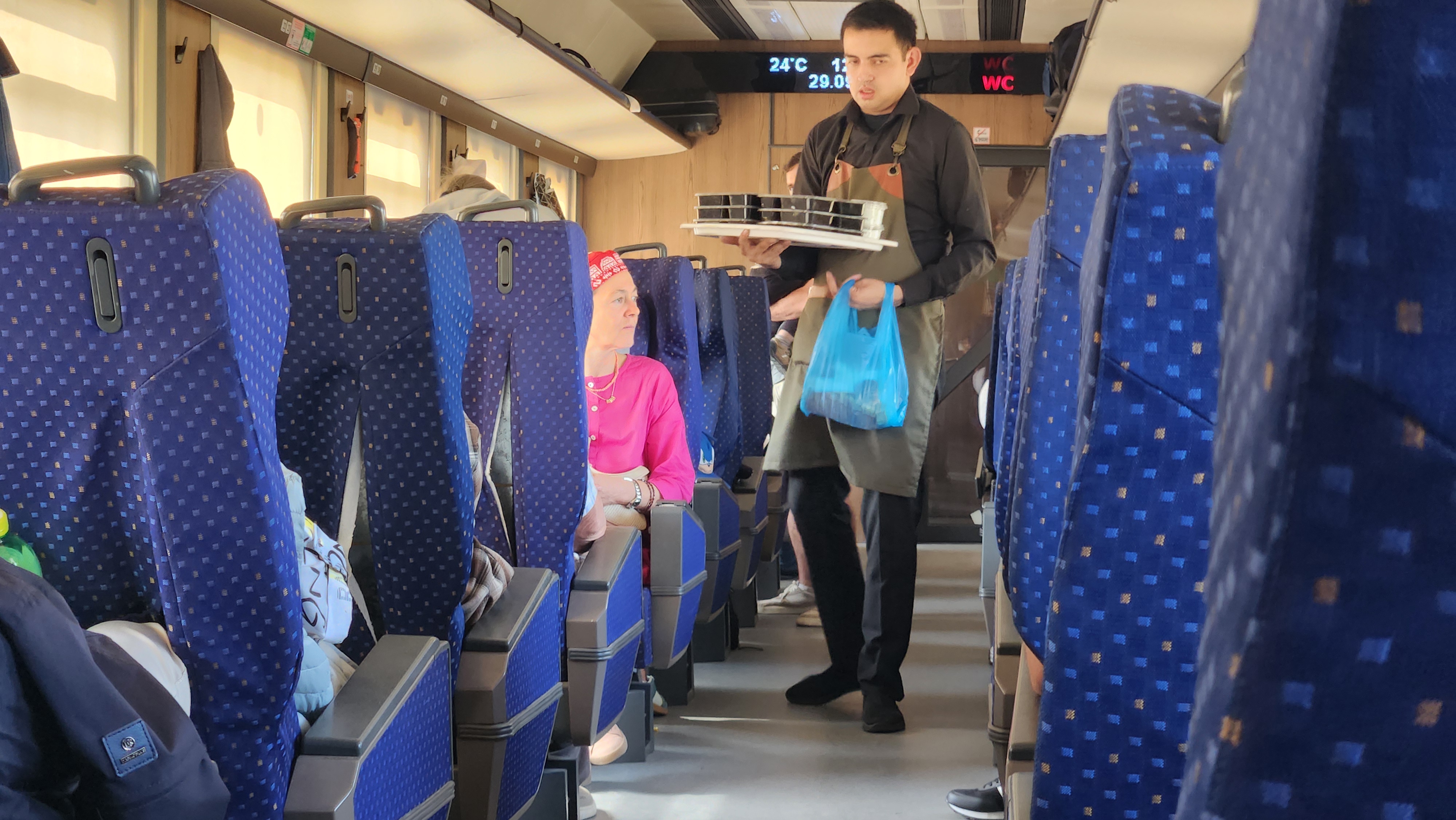 내가 탄 기차는 아프로시압은 아니었고, 우리나라로 치면 새마을호에 해당하는 기차인 것 같았다. 그렇지만 상태가 무척 좋았고, 무엇보다 2-1 배열이어서 자리도 굉장히 넓고 의자도 컸다. 앞에서 의자를 뒤로 눕혀도 전혀 신경쓰이지 않는 좌석간넓이였다.