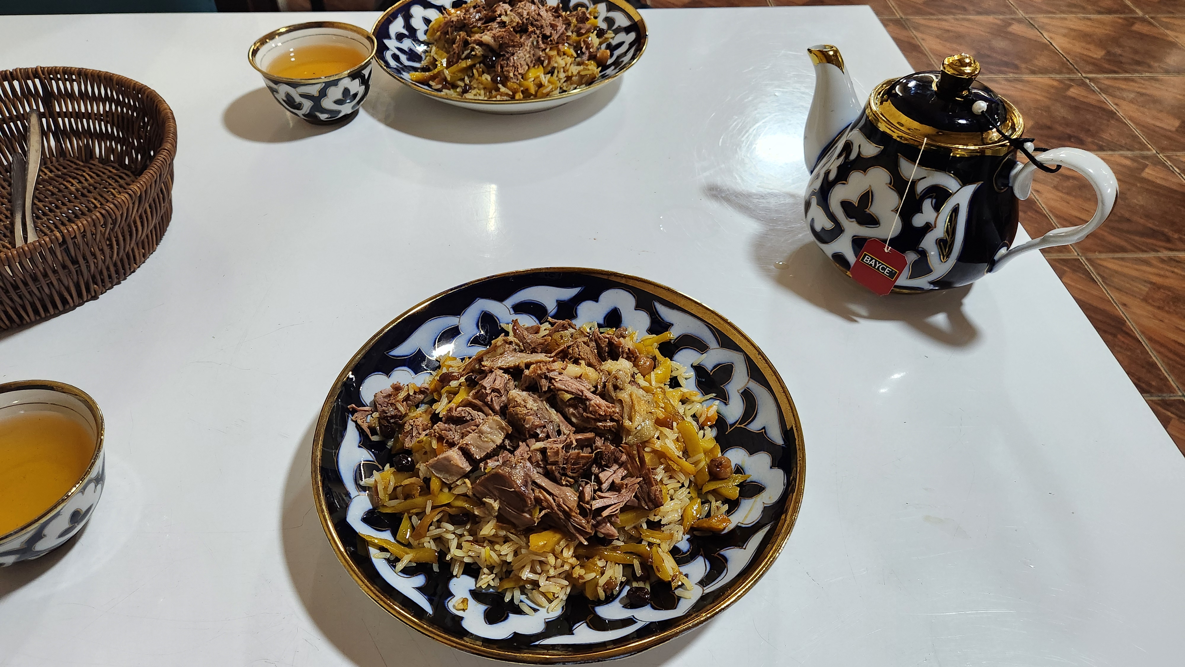 기본 오쉬는 40000숨, 고기를 추가하면 52000숨이었다. 우리는 당연히 고기 추가한다 것으로 시키고, 홍차를 함께 시켰다. 이 친구는 중앙아시아 와서 현지 음식을 거의 먹어본 적이 없다고 했고, 따뜻한 차를 같이 먹는게 놀랍다고 했는데 기름진 음식에 차가 정말 잘 어울린다는걸 알려주고 싶었다. 아무리 기름지더라도 차 한 입 하면 정말 싹 내려간다.