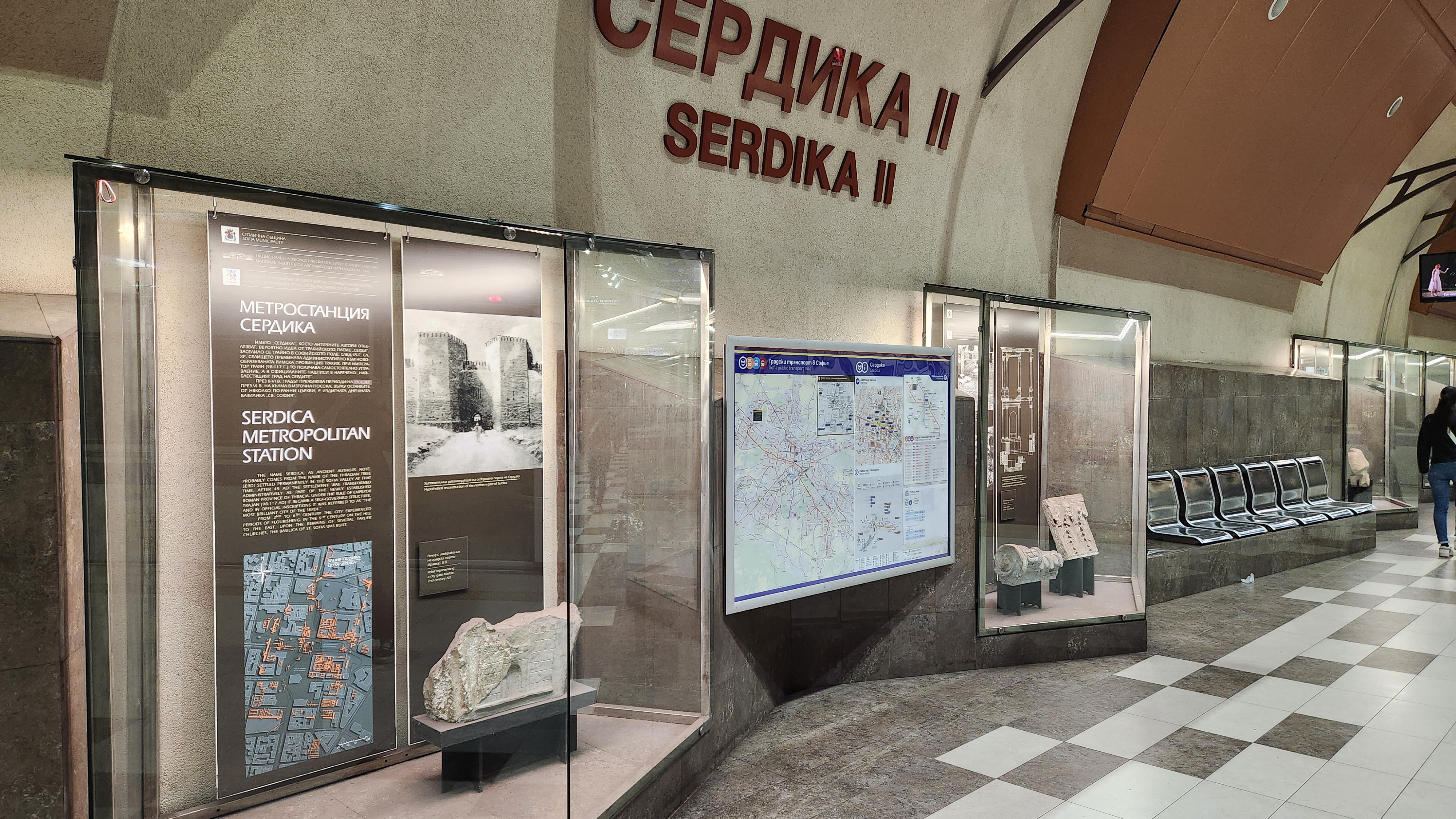 세르디카역은 굉장히 특이하게도 지하철역 내부에 로마시대의 유적이 전시되어있는 역인데, 2010년도 초에 지하철 2호선 공사를 하다가 로마시대의 유적이 발견되어 노선을 수정하고 그때 발견된 유물 일부를 지하철역에 함께 전시해두었다고 했다. 로마시대의 포럼을 밖에서도 잘 관찰할 수 있게 개방형 광장 형태로 만들어두어서 주변 경관과도 잘 어울렸다.