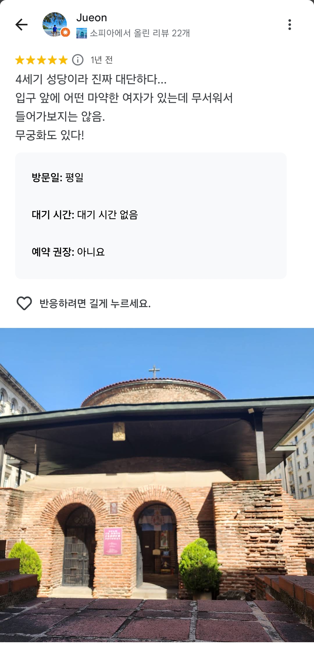 한 바퀴 둘러서 교회에 들어갔다. 앞에 어떤 여자가 돈 달라고 구걸하고 있다. 교회 측에서 왜 막지 않는지 궁금한데, 리뷰를 찾다가 우연히 1년 전에도 이 여자로 추정되는 사람이 구걸하거나 있다는걸 발견했다.
