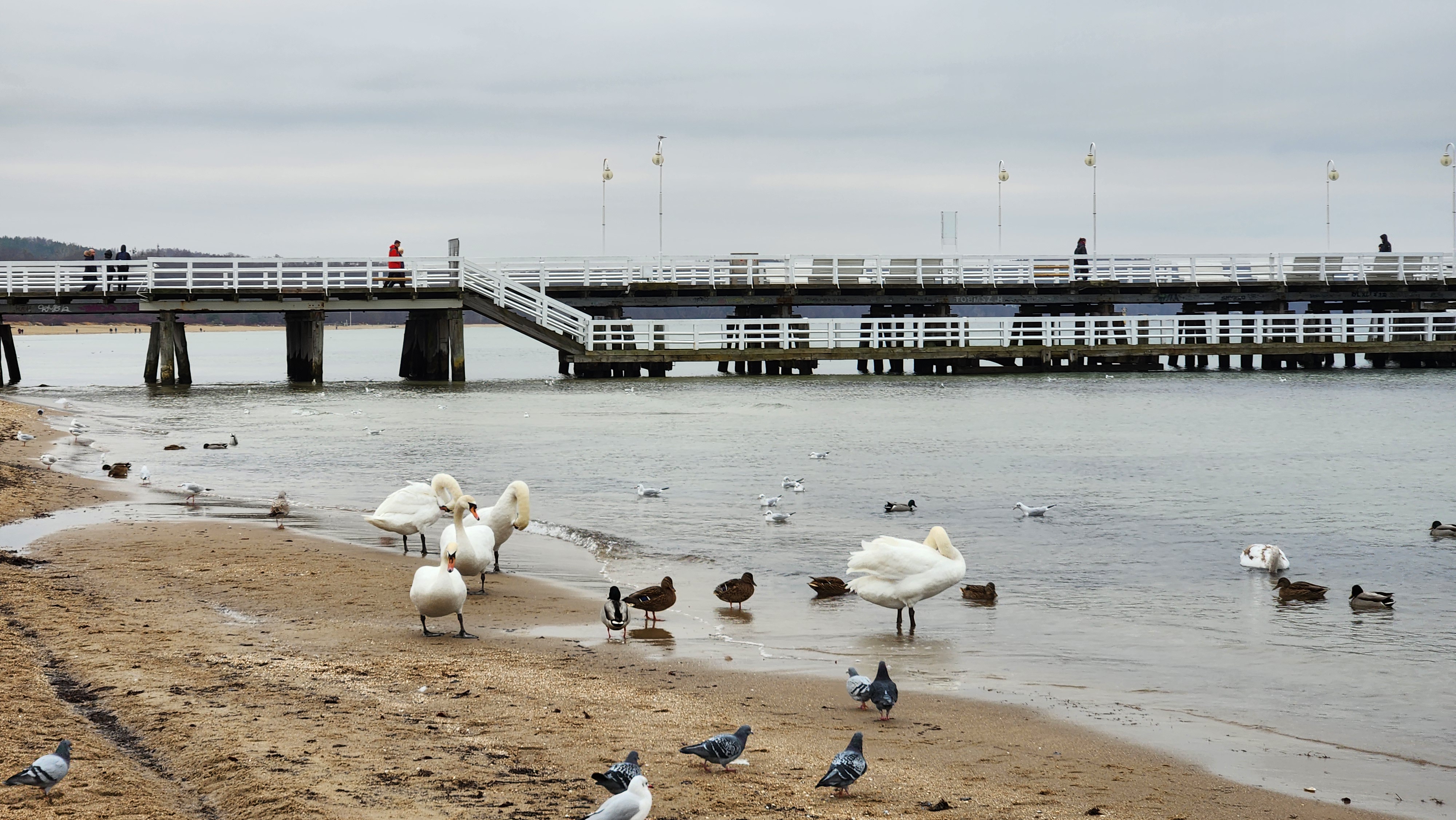 백조 옆에는 갈매기, 비둘기, 청둥오리 등 다양한 새들이 있었다.