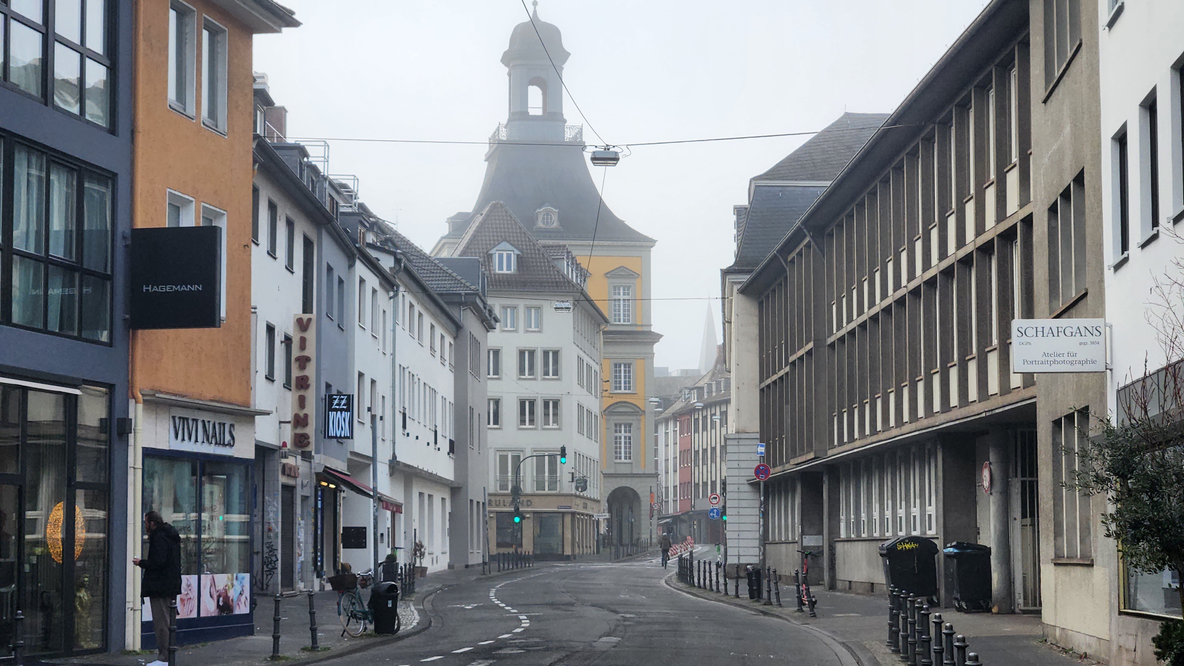 위 사진의 높은 탑은 원래 궁전으로 쓰이던 것이었다. 뒤셀도르프는 17세기 말부터 약 30년간 신성로마제국의 선제후국 팔츠의 수도로서 기능했는데, 탑은 당시 팔츠의 선제후던 요한 빌헬름 2세가 머무르던 뒤셀도르프 궁전의 일부였다. 팔츠 선제후국이 만하임으로 수도를 천도한 뒤, 화재로 궁전은 소실되고 지금은 탑만 남았다고 한다.