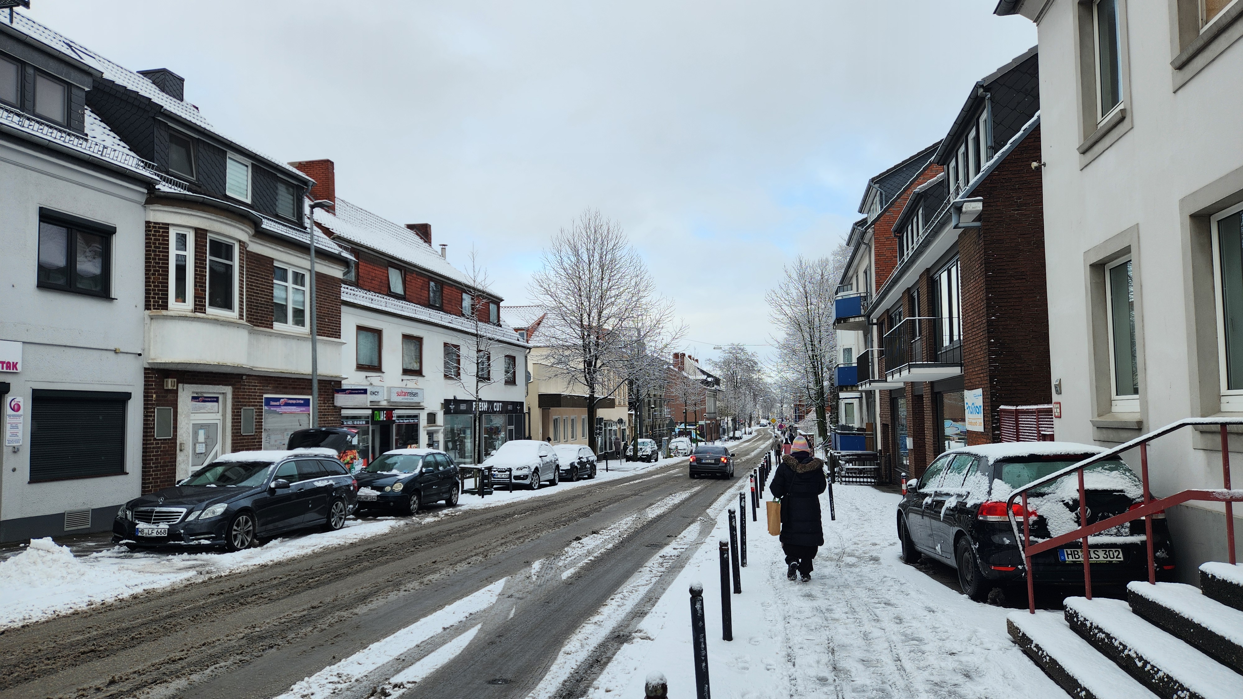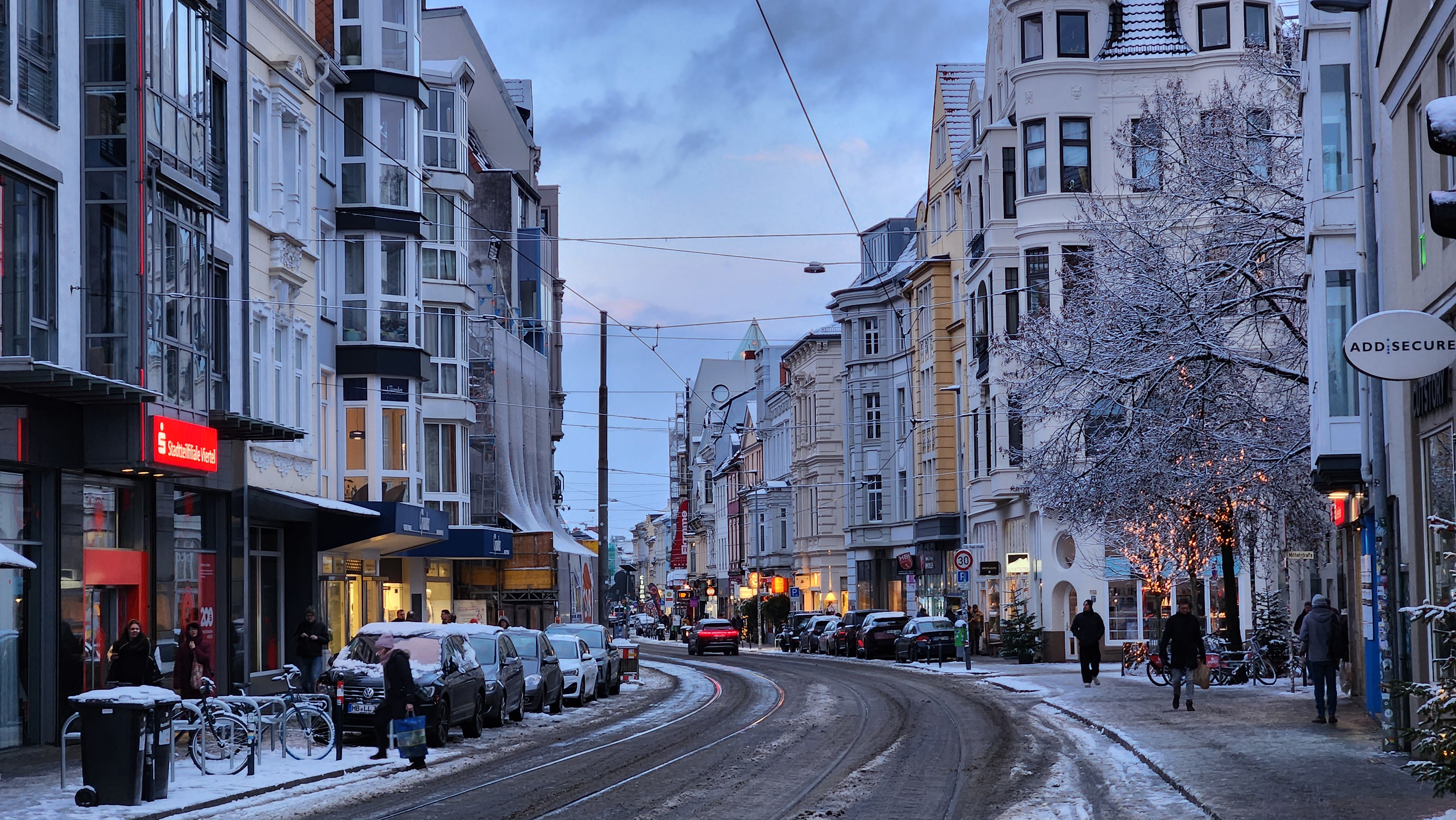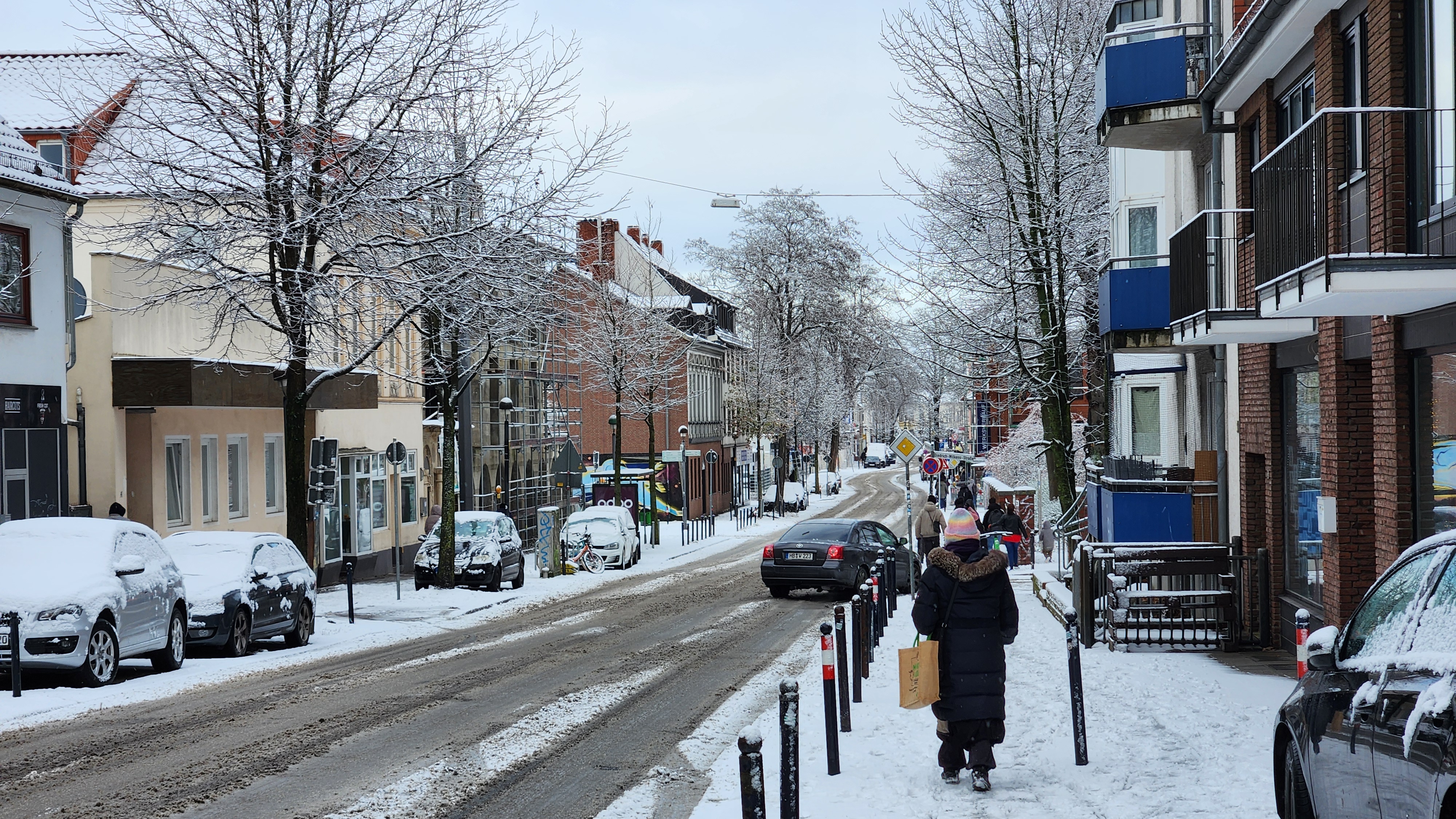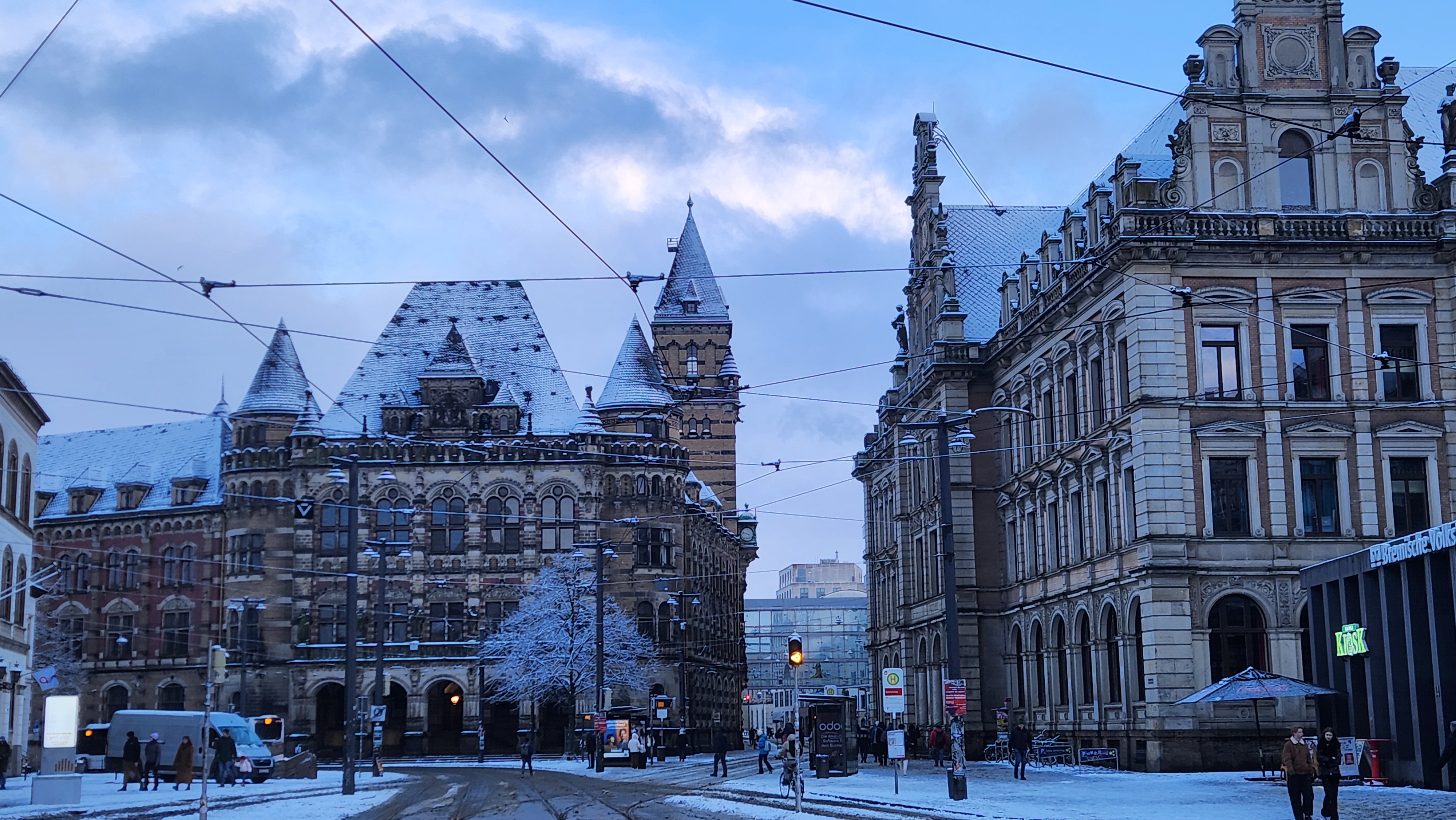 눈이 내리면 설경이 아름답지만, 가장 큰 문제는 더러워지는 길. 자동차나 트램이 다니는 길이 온통 회색빛으로 더러워져있다. 지나가다 자동차가 튀긴 흙탕물에 옷이 젖기라도 하면 대참사. 나는 언제나 옷을 빨고 다닐 수 있는 환경도 아니라 더 주의해야했다. 브레멘은 그렇게 큰 도시는 아니라 중앙역 근처 숙소에서 구시가지까지는 도보로 10분도 안걸리는데, 눈이 많이 와 길이 더러워진 상태여서 트램을 탔다.