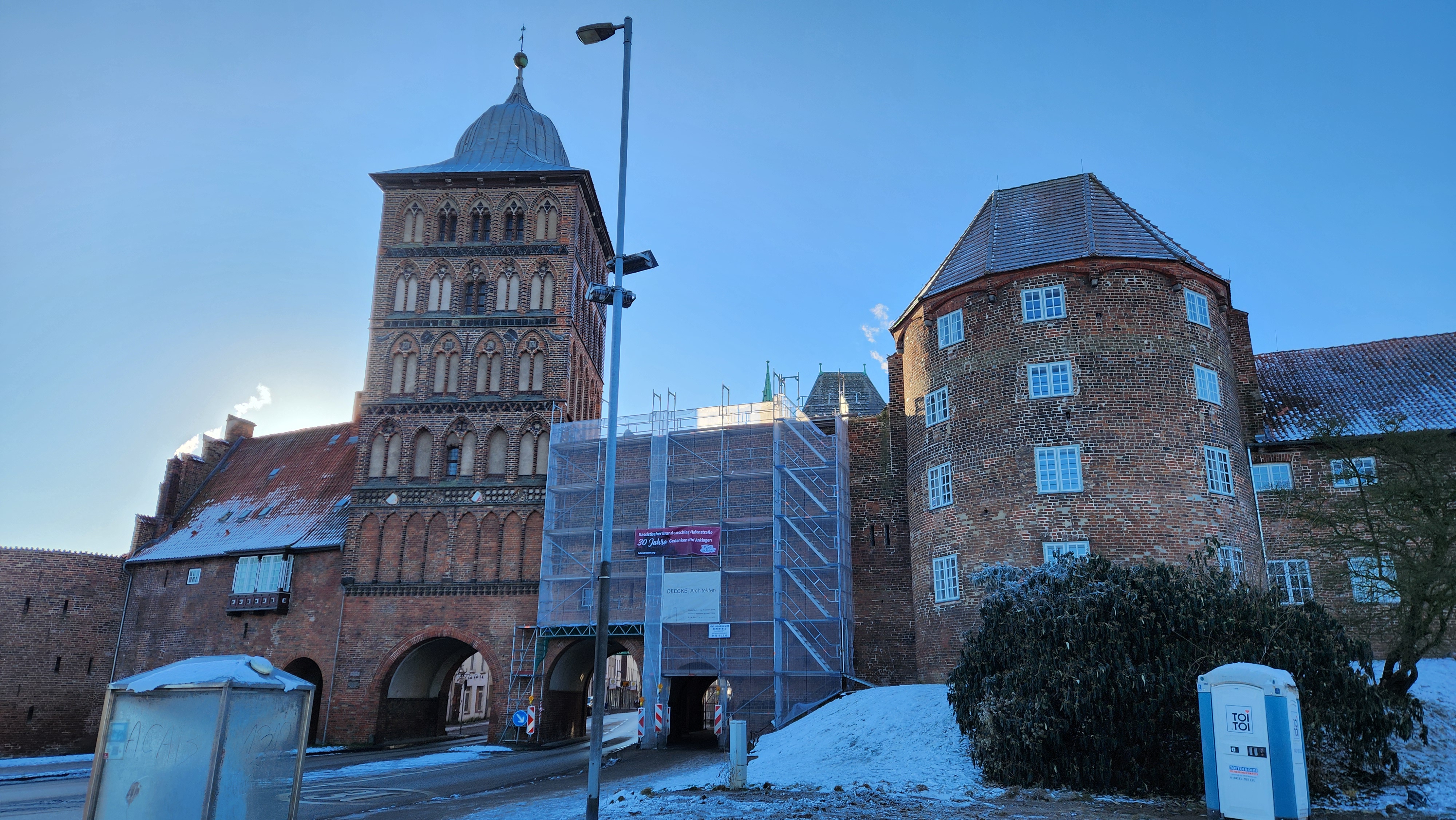 홀스텐 문의 뒤쪽에는 한자동맹의 상징인 흰색/붉은색 깃발과 Senatus Populusque Lubecensis - 뤼벡 의회와 시민들 - 의 약자인 S.P.Q.L. 이 적혀있다. '로마 원로원과 시민들' - Senatus Populusque Romanus, S.P.Q.R.이 떠올랐다.