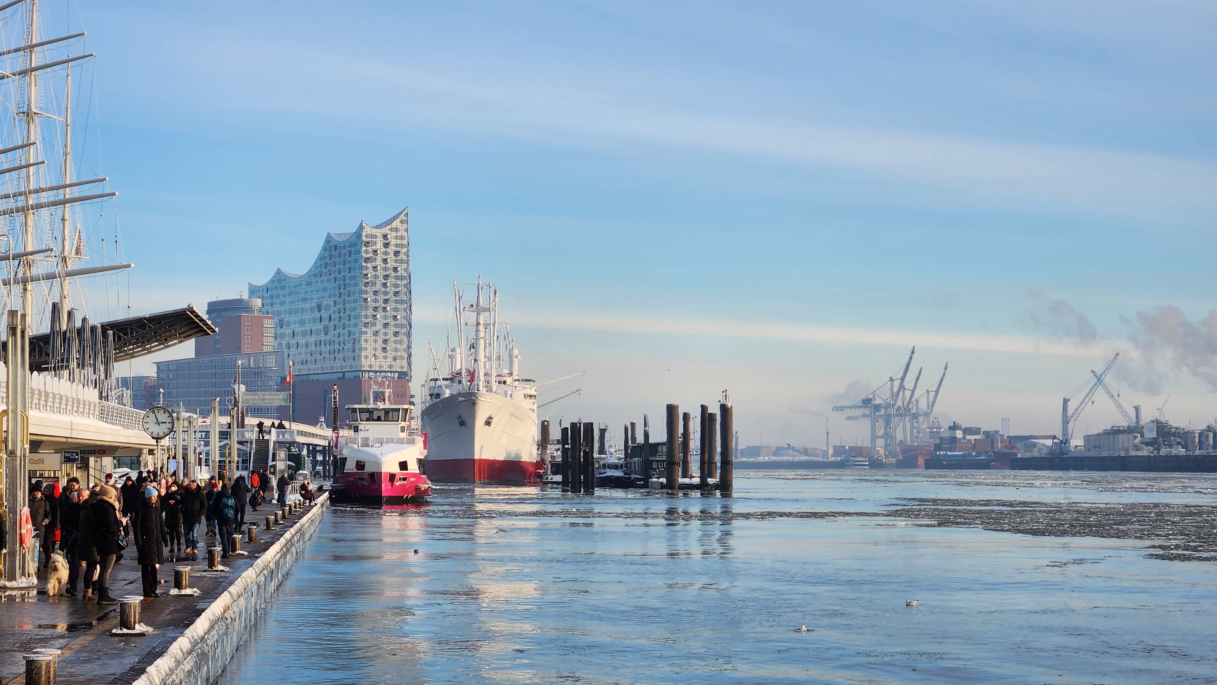 때마침 거대한 화물선이 함부르크 항으로 들어오고 있었다. 작은 배들이 화물선 양옆에서 도선하는 모습이 신기했다. 한국의 부산항이나 인천항은 국가주요시설로 지정되어 민간인의 출입은 물론 촬영이 엄격히 제한되는걸로 안다. 때문에 이런 장면을 촬영할 수도, 구경할 수도 없을텐데 함부르크까지 와서 이런 장면을 보게 될 줄은 몰랐다. 독일은 이런건 별로 신경쓰지 않는 타입인가? 한국처럼 잠재적국이 근처에 있는게 아니라서 그럴지도 모르겠다.