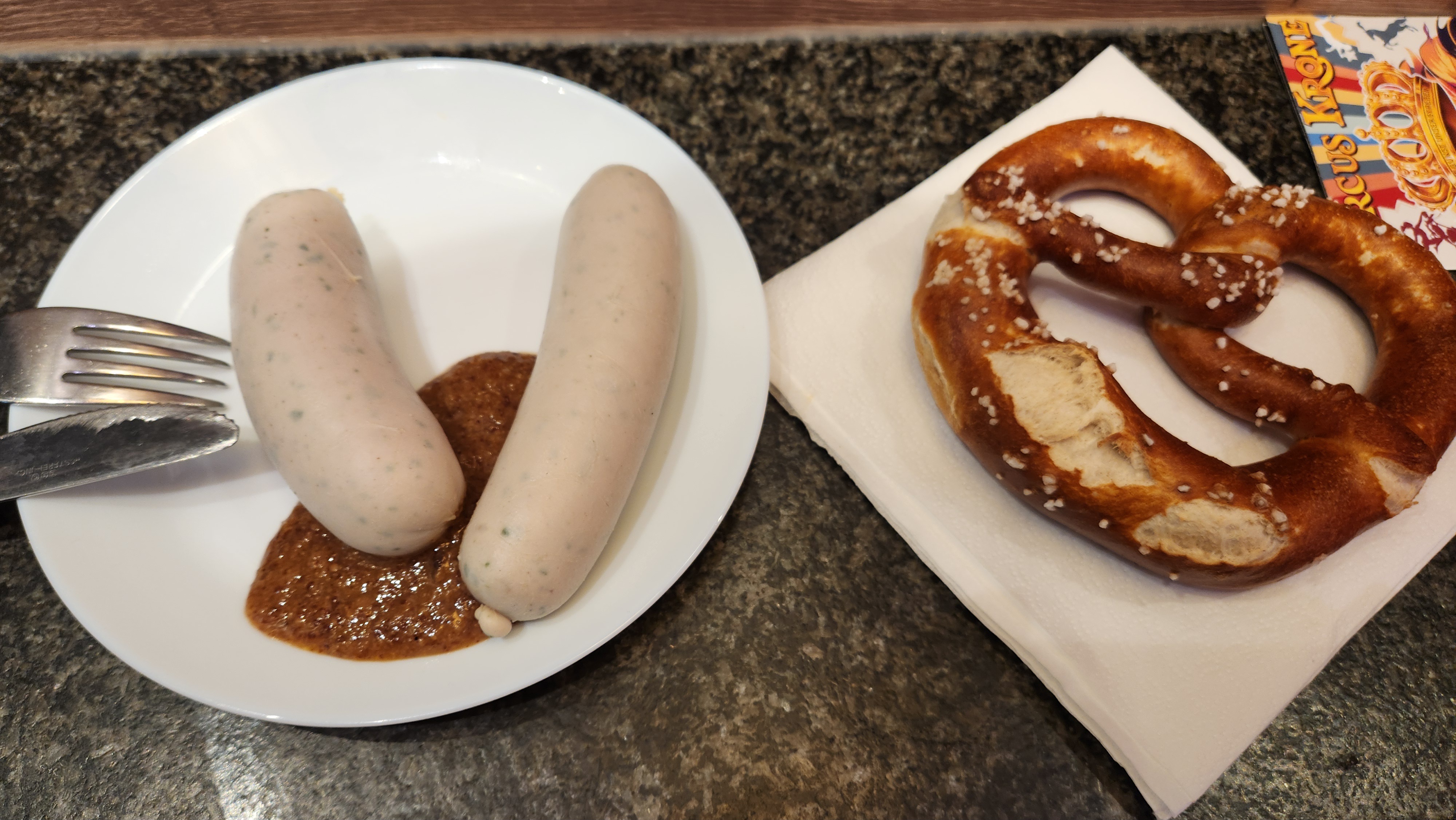 맛은.. 맛있기는 한데 솔직히 그냥 그랬다. 케세크라이너 소시지가 훨씬 더 맛있다. 약간 고수랑 후추같은 향신료 냄새가 꽤 강하게 나고, 좀 부드러운 느낌? 푸딩같은 식감이었다. 같이 나온 소스는 허니 머스타드 느낌이었는데, 같이 먹으니까 맛있었다. 프레젤은 그냥 프레젤 맛.